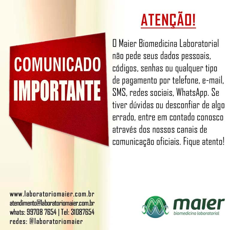 O Maier Biomedicina Laboratorial não pede seus dados pessoais, códigos, senhas ou qualquer tipo de pagamento por telefone, e-mail, SMS, redes sociais, WhatsApp. Se tiver dúvidas ou desconfiar de algo errado, entre em contado conosco através dos nossos canais de comunicação oficiais. Fique atento!